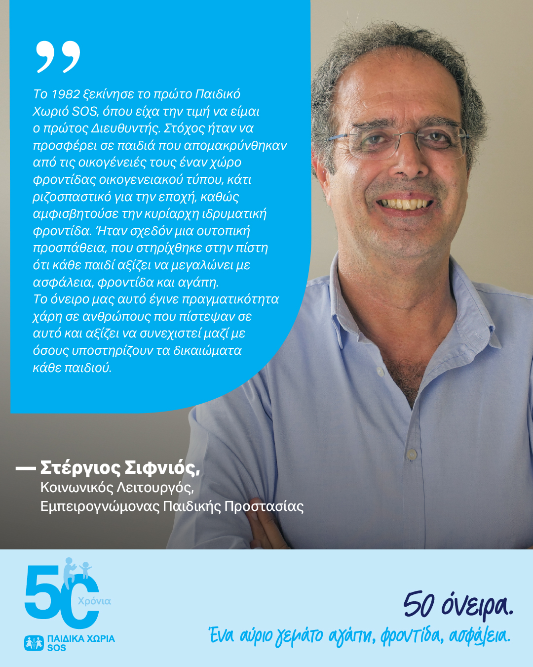 Μισός αιώνας δίπλα σε κάθε παιδί που μας χρειάζεται. Πενήντα χρόνια ιστορίας, με χιλιάδες μικρές και μεγάλες στιγμές, και μία μεγάλη αγκαλιά, από τη Θράκη έως την Κρήτη, από ανθρώπους που δεν έπαψαν ποτέ να πιστεύουν σε ένα καλύτερο μέλλον για κάθε παιδί.