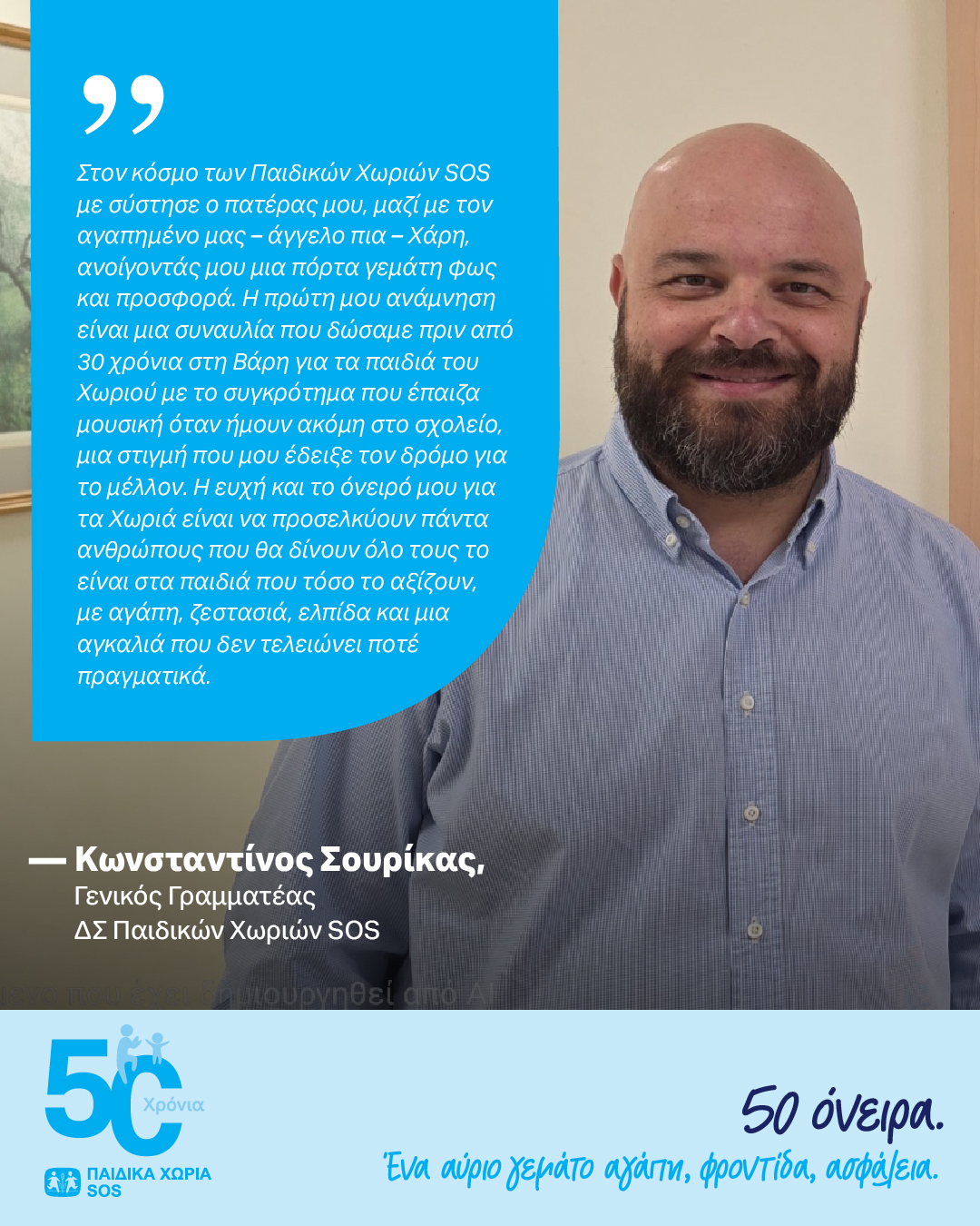 Στο πλαίσιο των 50 χρόνων μας, δημιουργήσαμε ένα μωσαϊκό σύντομων μαρτυριών από ανθρώπους που υπήρξαν μέρος αυτής της διαδρομής. Παιδιά που μεγάλωσαν στα Χωριά μας, εργαζόμενοι που υπήρξαν μέρος αυτής της πορείας, αλλά και άνθρωποι που στηρίζουν το έργο μας, μοιράστηκαν τις δικές τους ιστορίες.