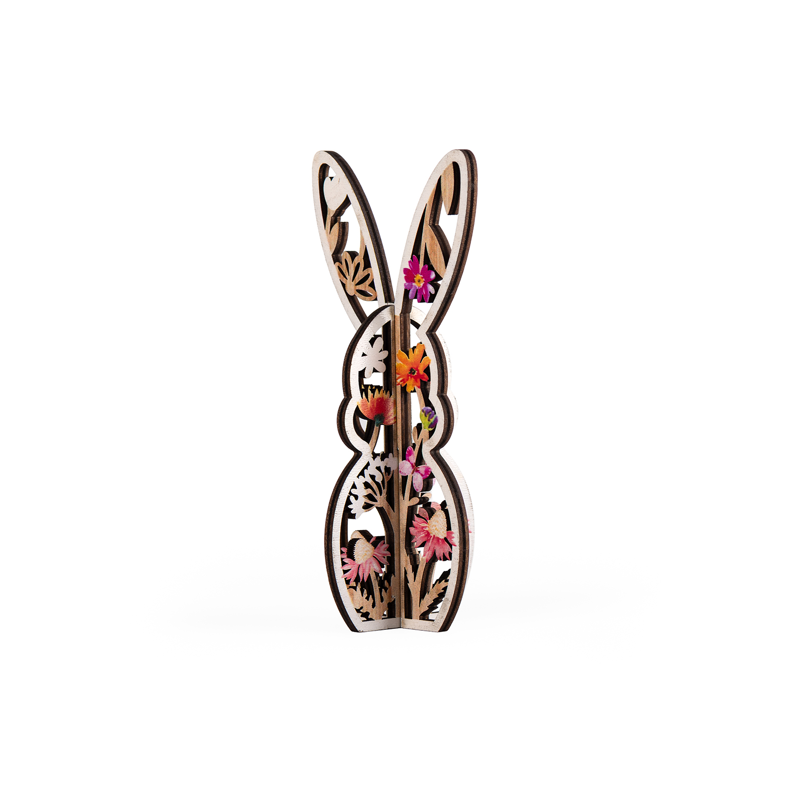 Ξύλινο διακοσμητικό σε σχήμα πασχαλινού λαγού, με λουλουδάκια και λευκές λεπτομέρειες